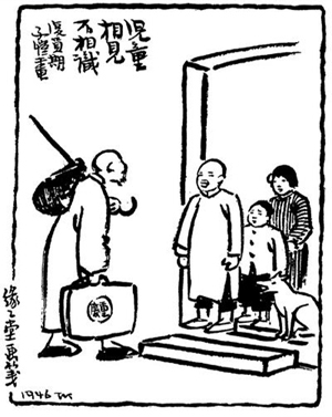 抗戰(zhàn)勝利后,由于交通困難,我家到1946年夏才從大后方回到江南。當(dāng)父親第1次還鄉(xiāng)探望故里—浙江石門灣時(shí),那里已成一片廢墟,不可復(fù)識(shí)。鄉(xiāng)親們看見父親一行人操著道地的石門灣土白邊走邊談時(shí),覺得十分驚奇:這小鎮(zhèn)上怎么來(lái)了一群陌生人,說(shuō)話卻全是本地口音!后來(lái),父親聽見背后有人竊竊私語(yǔ):“豐子愷!”“豐子愷回來(lái)了!”但父親一路走著,卻不見一個(gè)認(rèn)識(shí)的人,因?yàn)檫@些人抗戰(zhàn)前都是孩子或少年,現(xiàn)在都已變成了成人。父親若想要認(rèn)識(shí)他們,只有問(wèn)他的父親叫什么。父親說(shuō),“兒童相見不相識(shí),笑問(wèn)客從何處來(lái)”這兩句詩(shī),從前是談?wù)劧眩氩坏饺缃褡约鹤隽嗽?shī)中的主角!